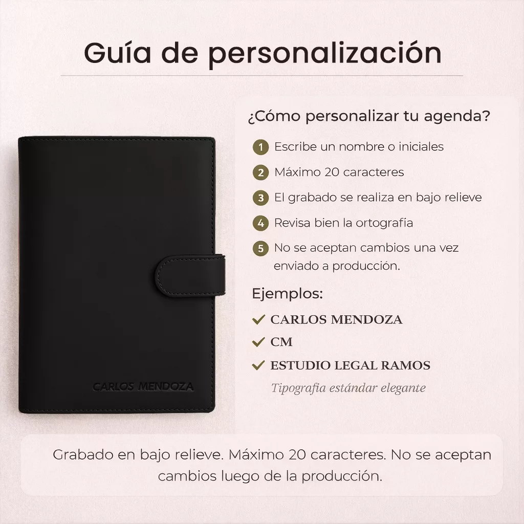 Personaliza tu agenda con tu nombre, iniciales o logotipo. El grabado se realiza con maquinaria profesional para asegurar un acabado limpio y duradero. Cada agenda diaria 2026 de cuero personalizada es única.