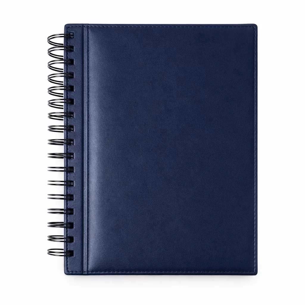 Cuaderno A4 anillado con tapa de cuero y anillado metálico doble. Incluye 160 hojas, diseño ejecutivo y acabado resistente, ideal para oficina, estudio o regalo corporativo.